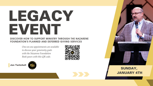Approximately 60% of Americans don’t have an estate plan that will suitably and efficiently care for their family and loved ones. We believe it’s good Christian stewardship to help you make these critical plans. The Nazarene Foundation has made it possible for you to start a will & powers of attorney through their website - for free! Jon Twitchell will provide helpful information about these documents and why they’re so important